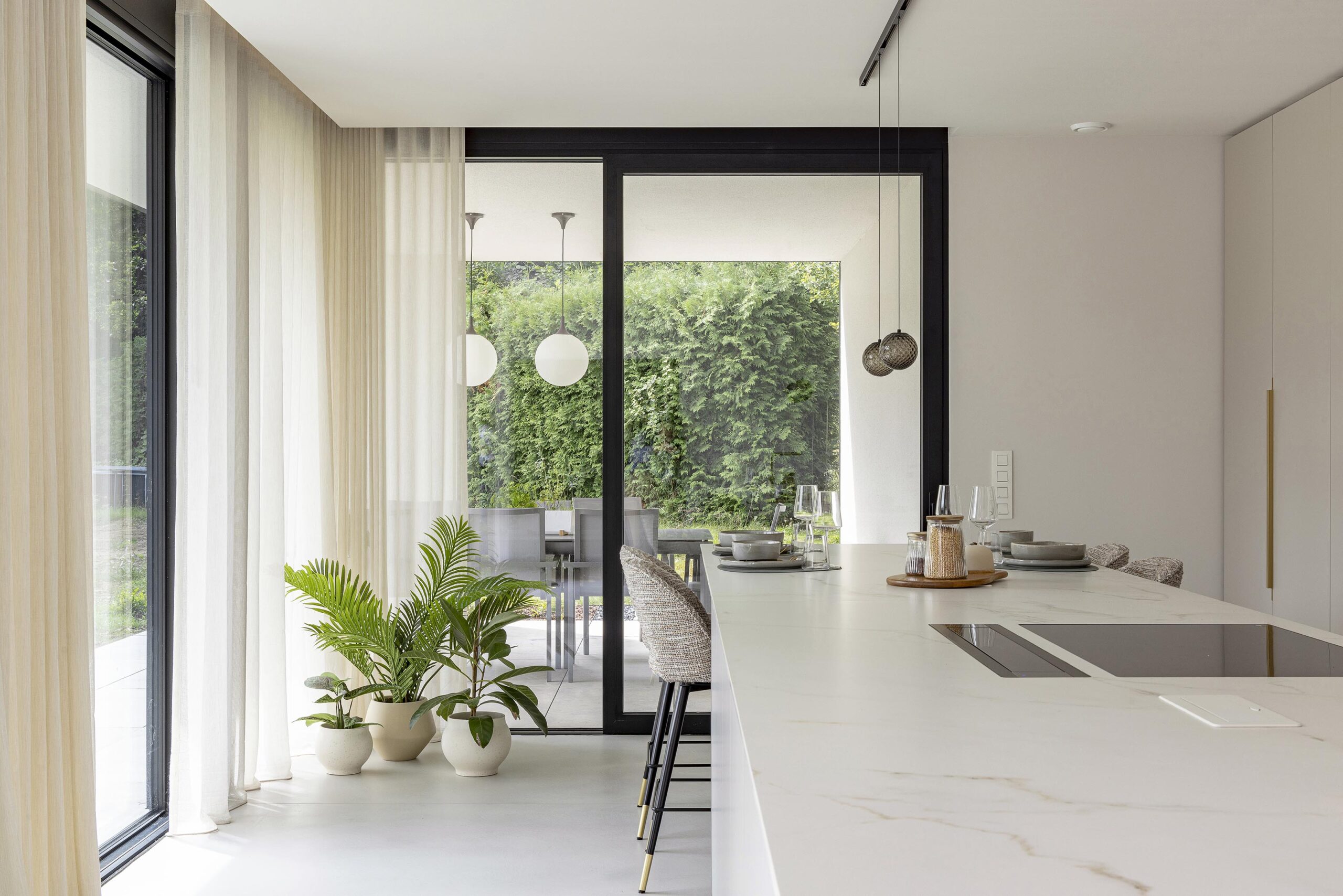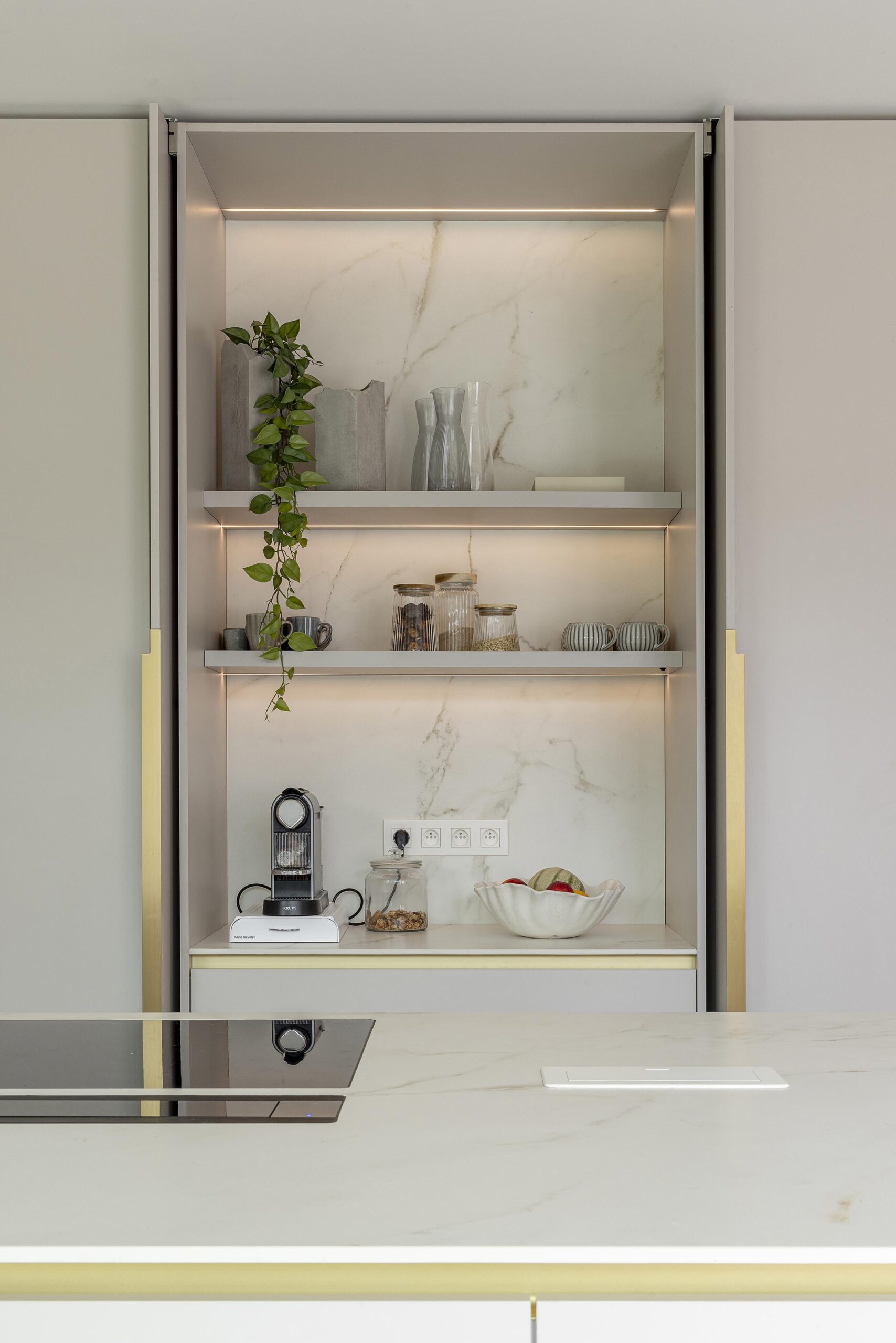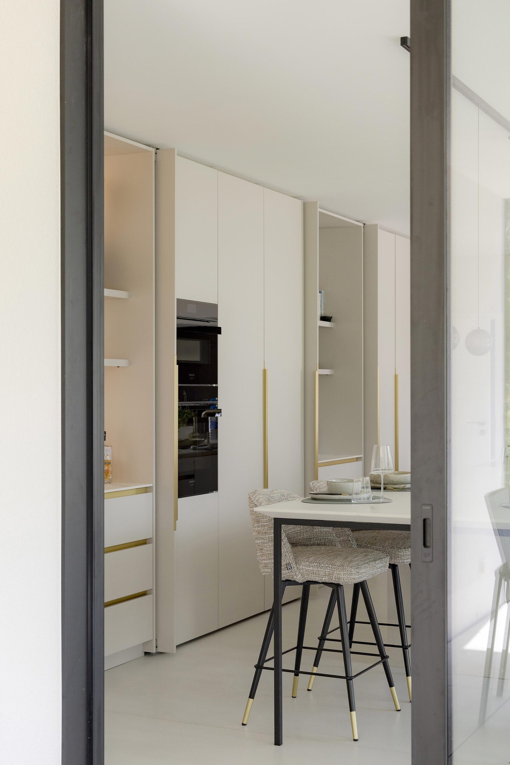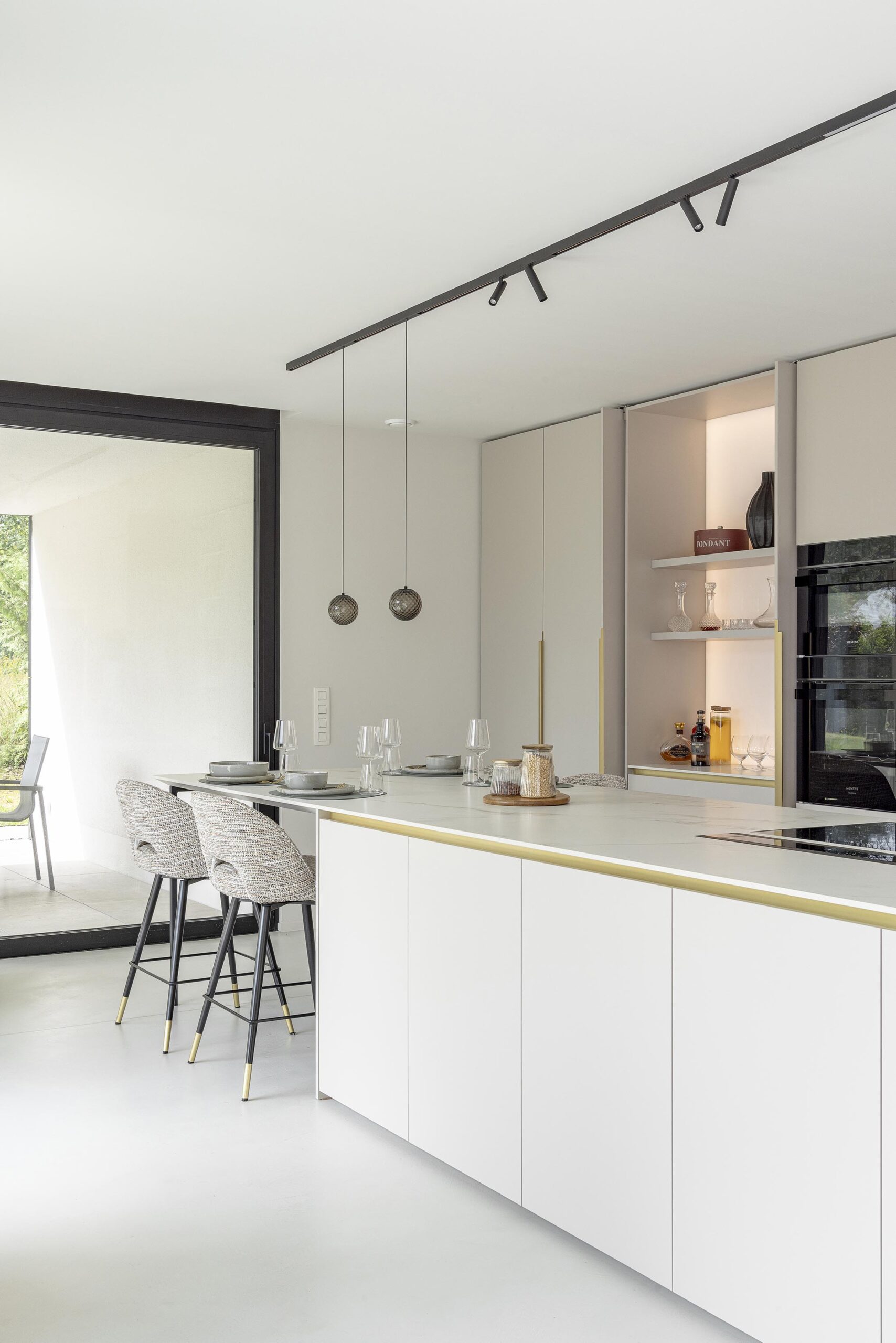 La particularité de ce projet réside dans la construction d’une annexe résolument contemporaine, presque entièrement vitrée, destinée à accueillir la nouvelle cuisine. Entièrement dessinée sur mesure, cette pièce bénéficie d’une luminosité exceptionnelle et se distingue par de subtiles touches de doré, présentes dans les prises en main et la robinetterie. Chaque détail a été soigneusement pensé afin de créer un espace à la fois élégant, fonctionnel et harmonieux.