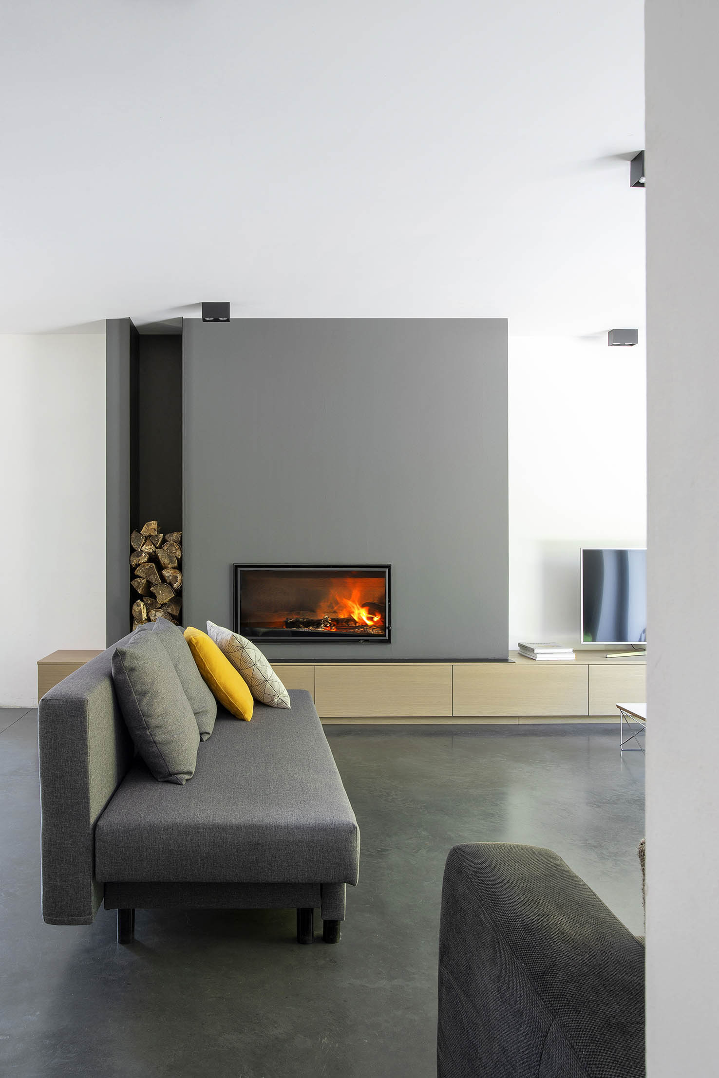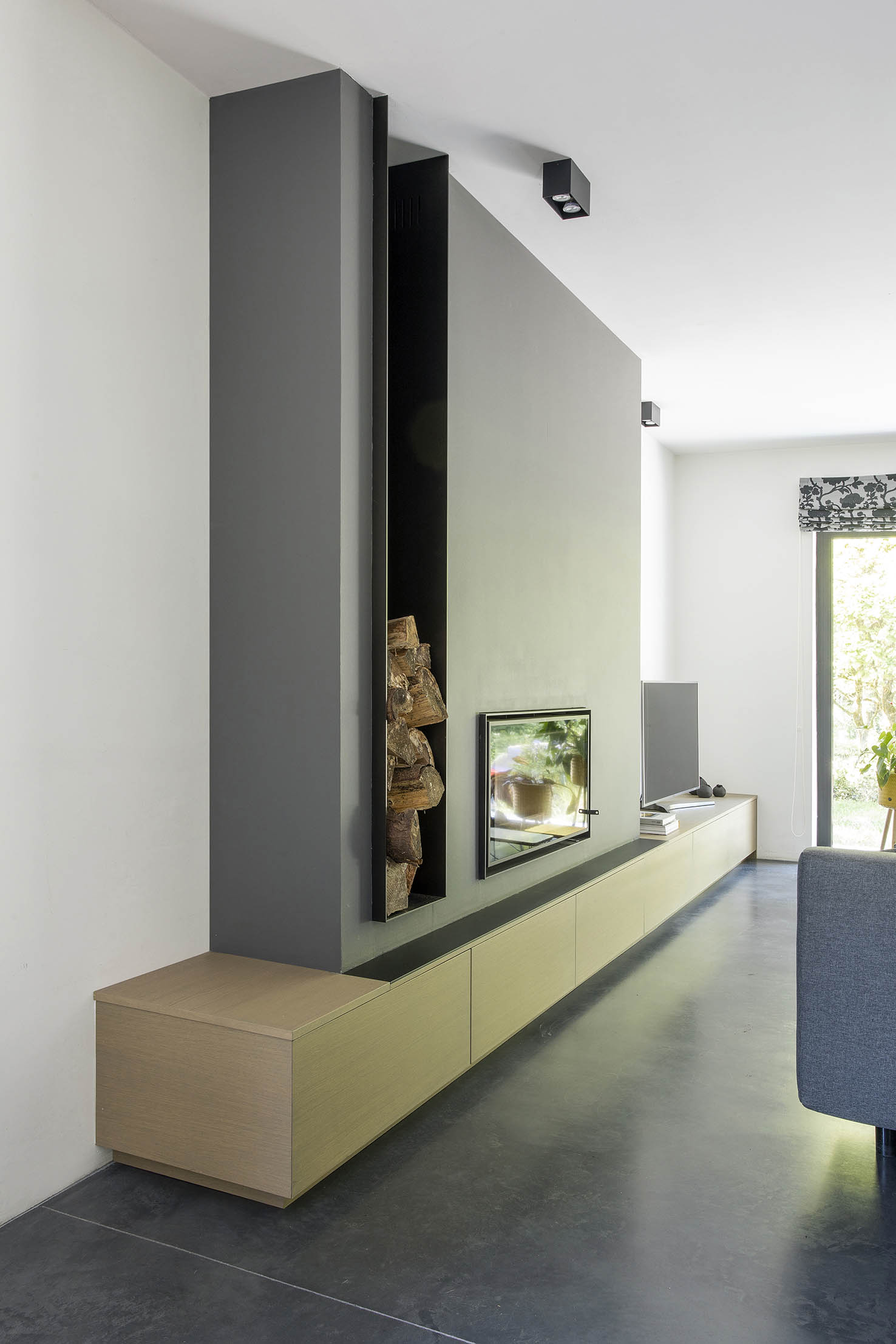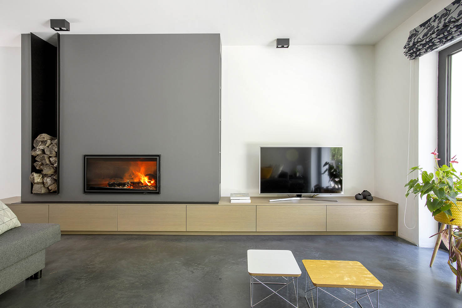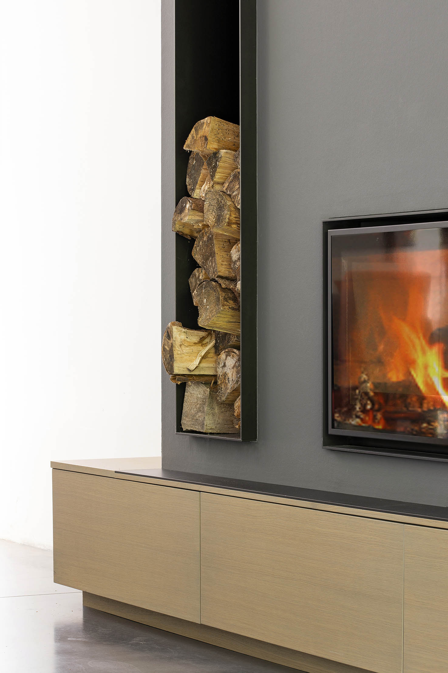 Chaque détail a été pensé minutieusement : la coupe à onglet du dernier tiroir ainsi que l’intégration d’une tôle dans le plan horizontal pour augmenter la résistance du meuble lorsqu’on enfourne les bûches. La rencontre entre un foyer et l’architecture d’intérieur donne naissance à des réalisations souvent exceptionnelles, conçues sur mesure et fortement personnalisées.