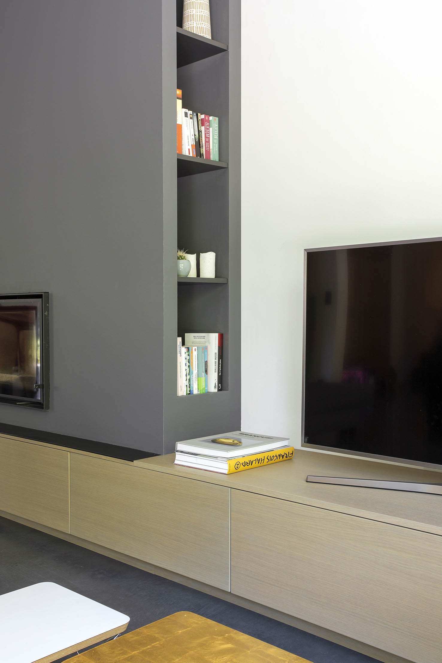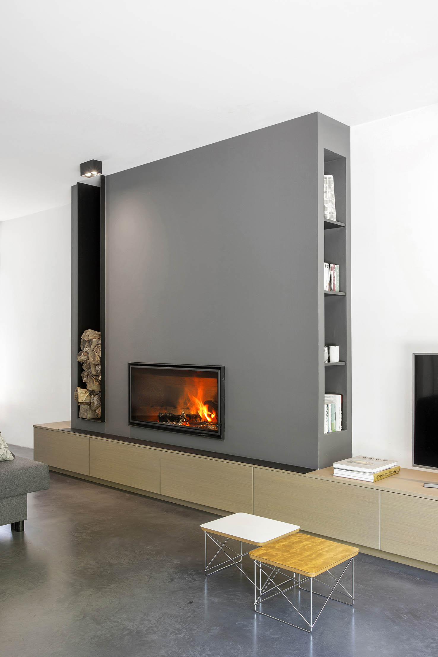 L’habillage de cet insert se compose de rangements fermés en partie basse, apportant une assise horizontale. Une niche latérale en plaque de plâtre offre un espace pour les livres et objets, tandis qu’un rangement vertical en tôle noire poudrée crée une vue sur les bûches et ajoute un élégant élancement vertical. Une combinaison réussie de fonctionnalité et d’esthétique.