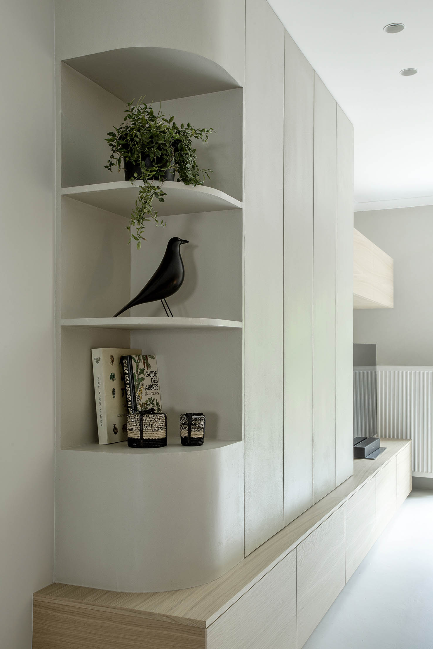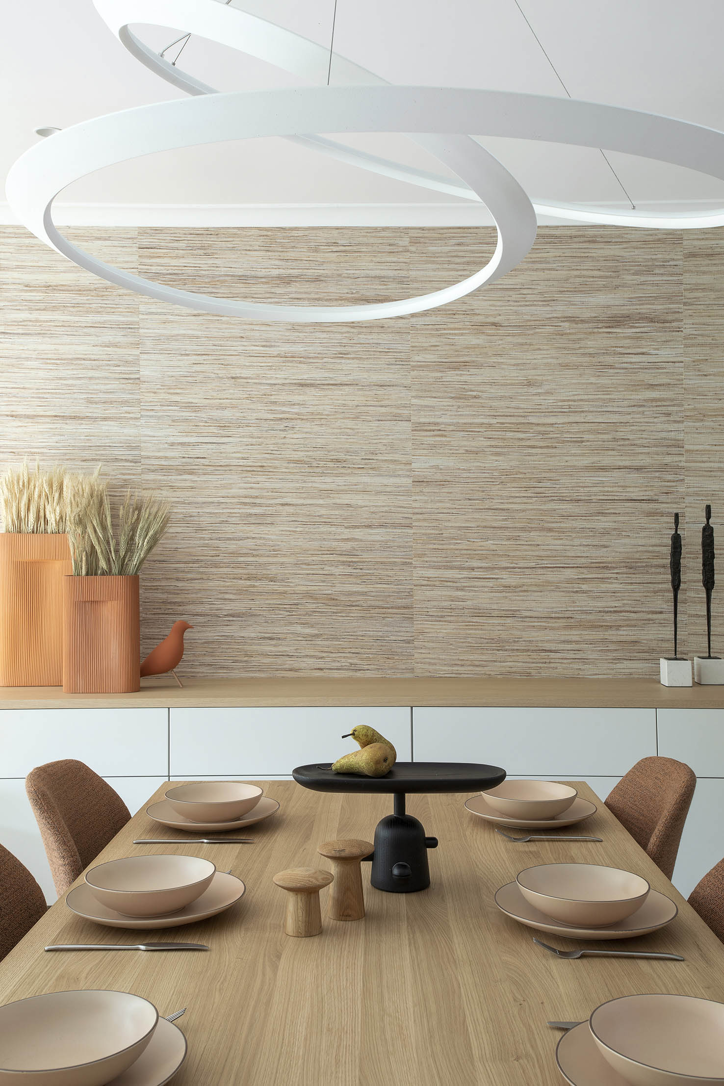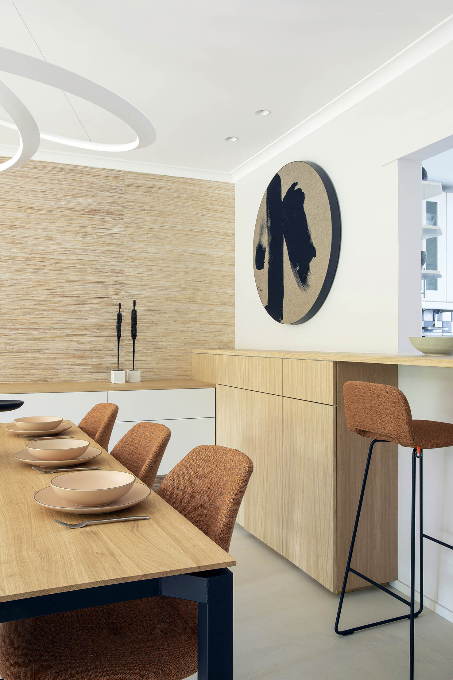 Le mobilier sur mesure est parfaitement intégré, grâce à nos artisans hautement qualifiés, qui ont réalisé un travail méticuleux. L’implantation des spots a été entièrement revue, afin de mettre en valeur la structure du papier peint et du béton ciré, ainsi que l’œuvre d’art très graphique dénichée par nos soins. La suspension, légère et aérienne, habille parfaitement l’espace. La lumière est dimmable. On la choisira plus intense pour travailler, et plus douce dans l’intimité.