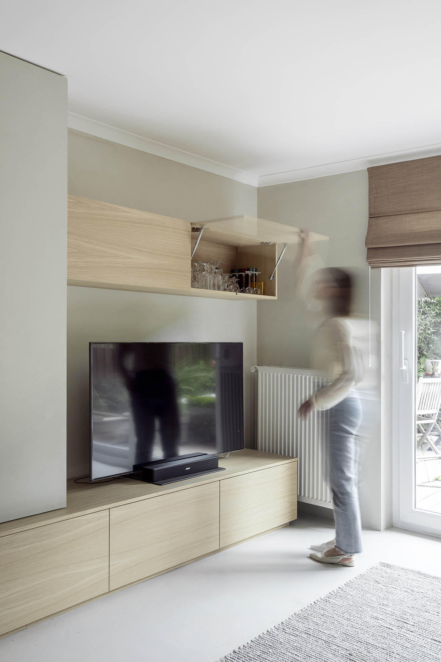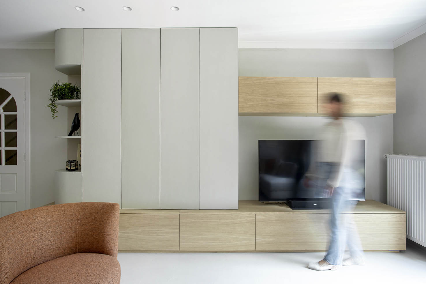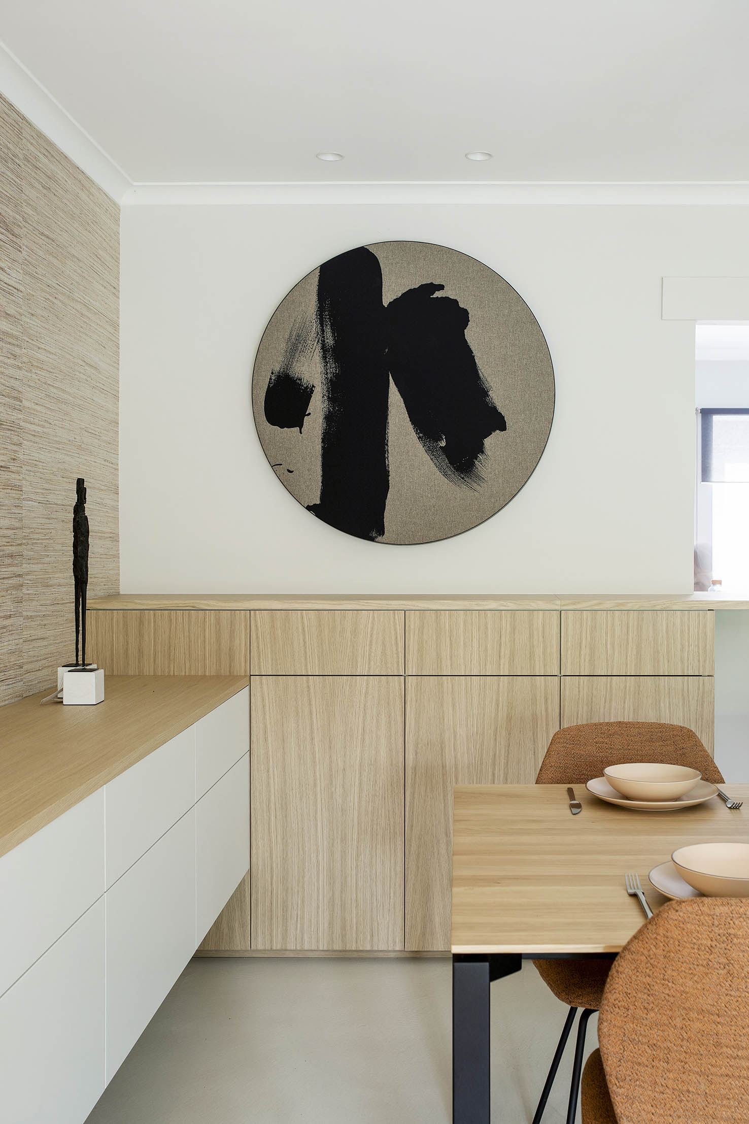 Le mobilier sur mesure est parfaitement intégré, grâce à nos artisans hautement qualifiés, qui ont réalisé un travail méticuleux. L’implantation des spots a été entièrement revue, afin de mettre en valeur la structure du papier peint et du béton ciré, ainsi que l’œuvre d’art très graphique dénichée par nos soins. La suspension, légère et aérienne, habille parfaitement l’espace. La lumière est dimmable. On la choisira plus intense pour travailler, et plus douce dans l’intimité.