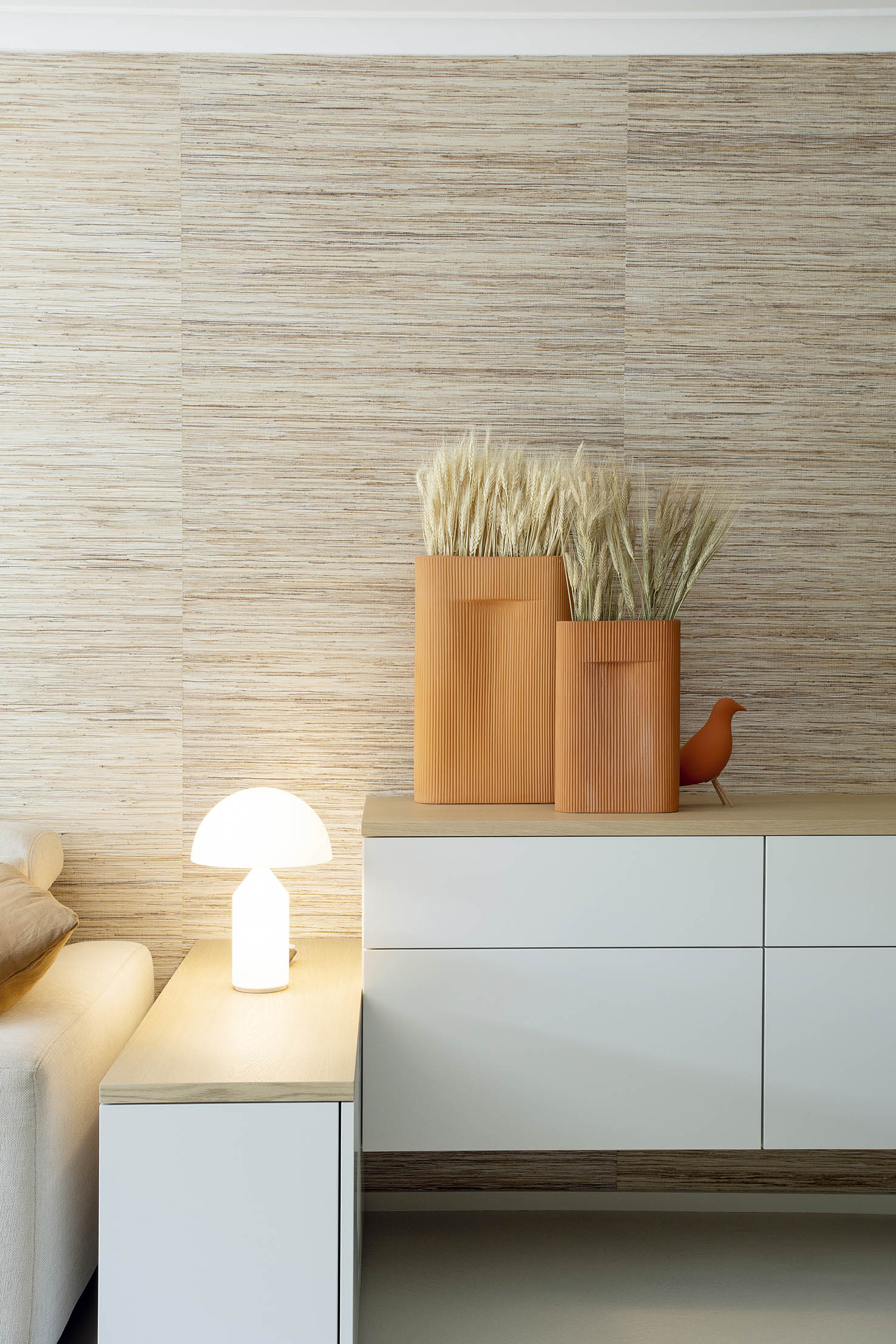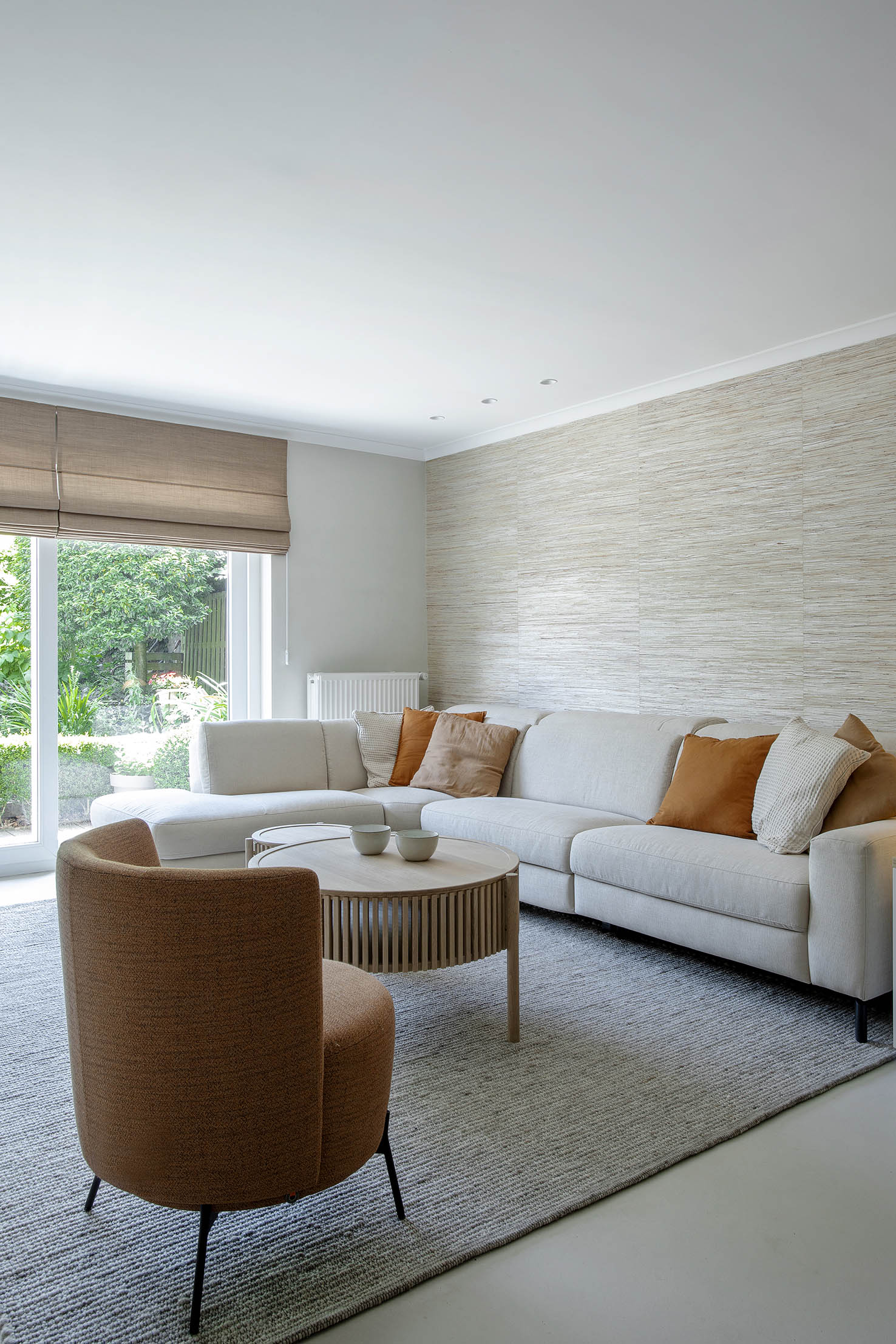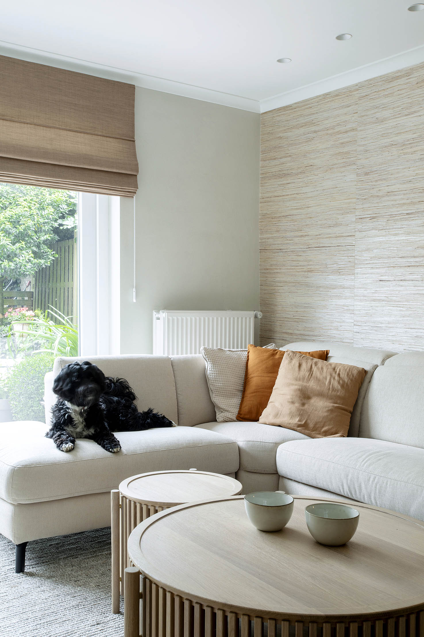 La rénovation de cette grange a métamorphosé le salon et la salle-à-manger en un lieu accueillant et chaleureux. Les teintes douces de beige et de terracotta créent une ambiance calme, tandis que le papier peint en fibres végétales, fabriqué à partir de paille tressée, apporte de la texture et une sensation de bien-être. Une harmonie parfaite entre le charme rustique et le confort moderne.
