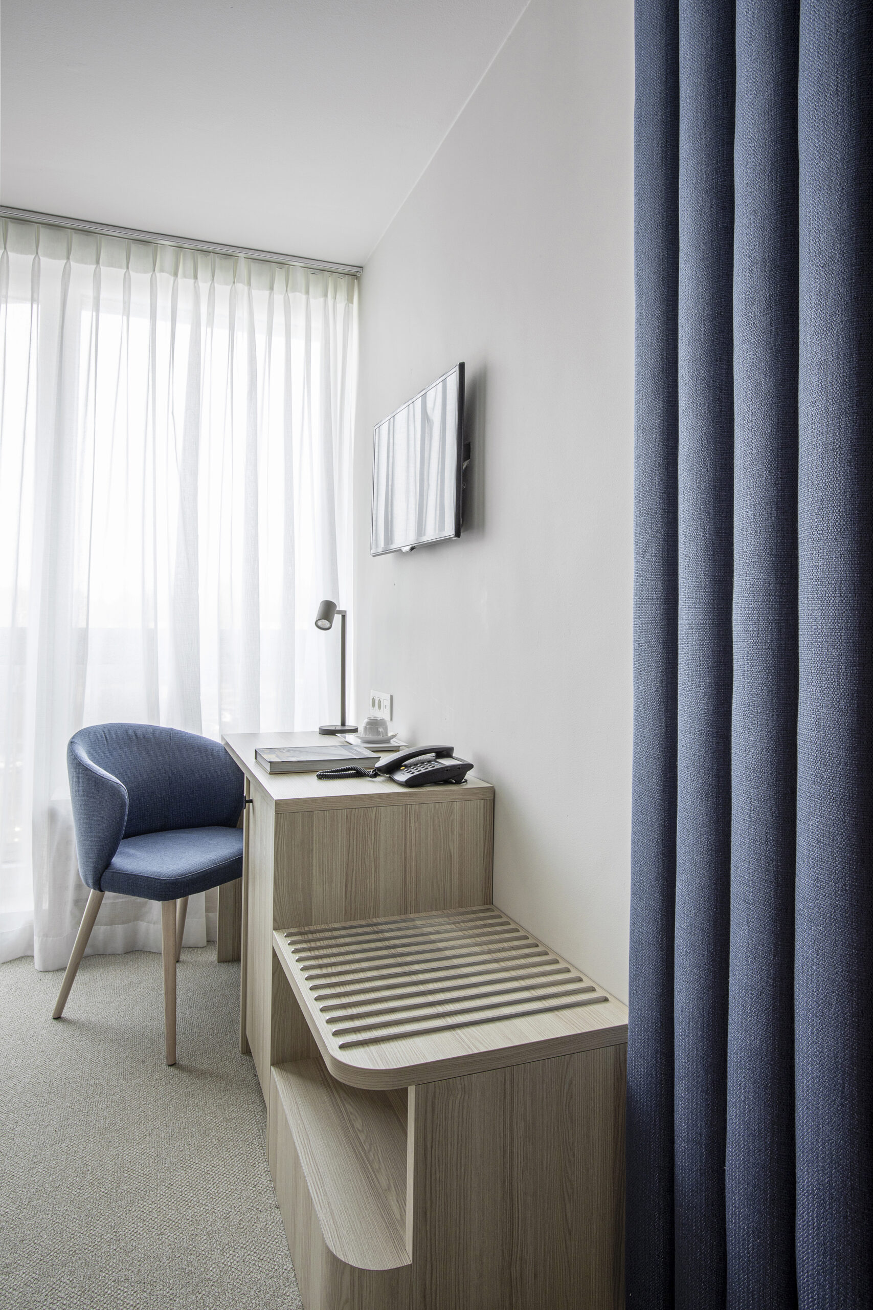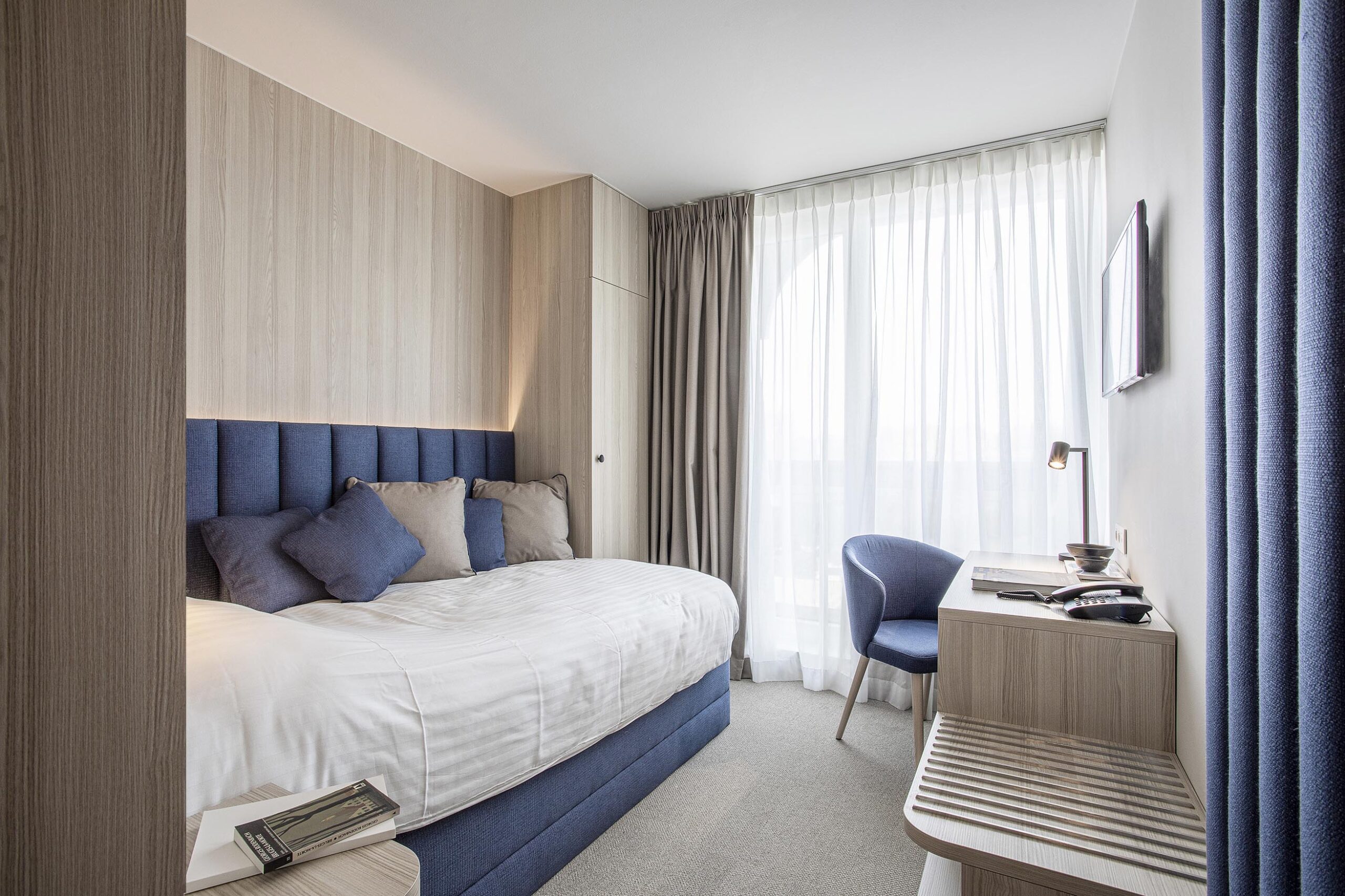 L’aménagement de cette chambre de 8 m² a relevé le défi d’intégrer un lit de 210 cm sur 120 cm, un bureau, une porte-valise, un mini-bar, une garde-robe et une table de nuit. Le mobilier sur mesure a été la clé de cette transformation réussie, optimisant l’utilisation de l’espace tout en maintenant le confort et la fonctionnalité. Un exemple convaincant de la puissance du design personnalisé pour maximiser l’efficacité dans les espaces restreints.