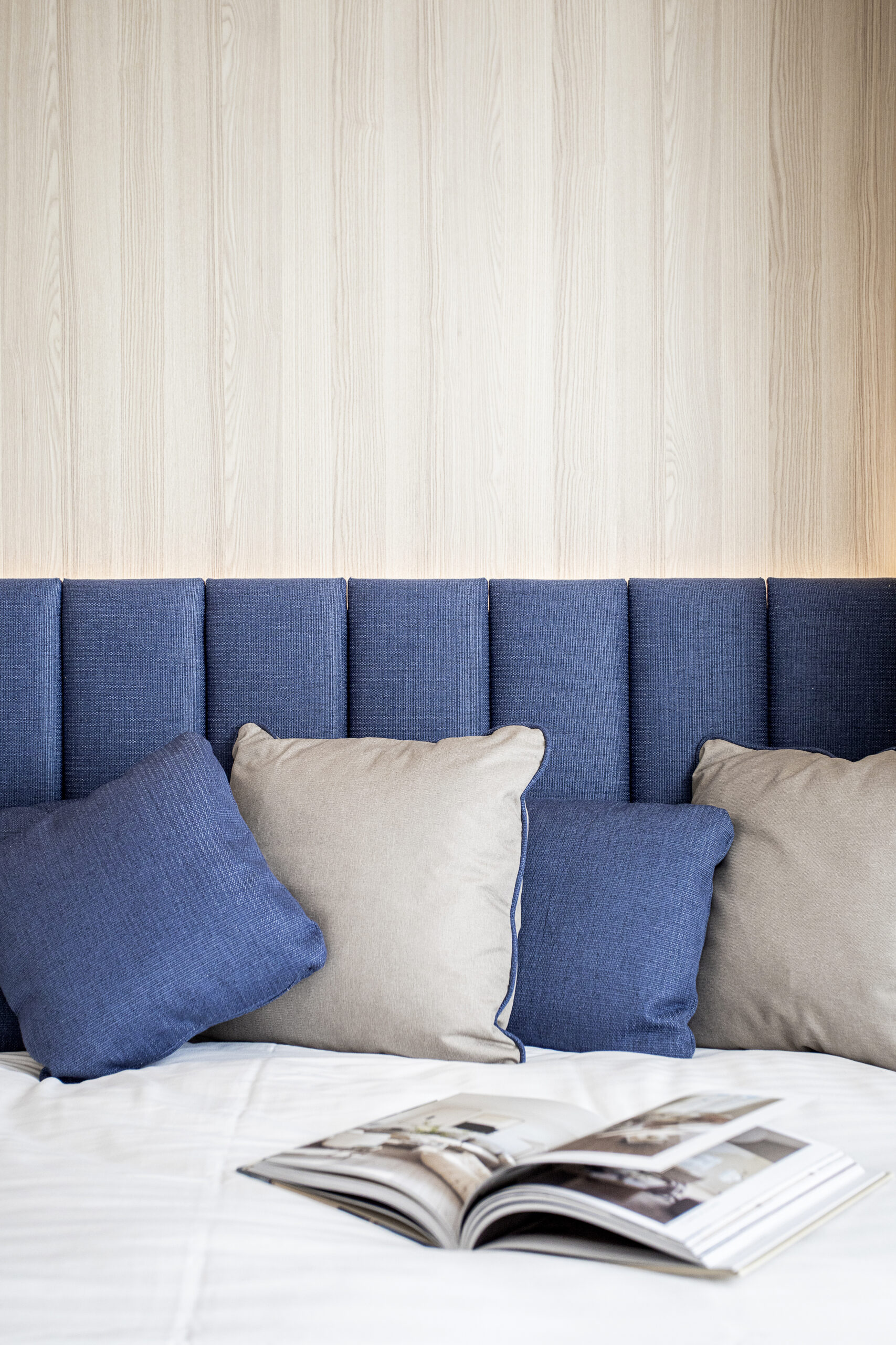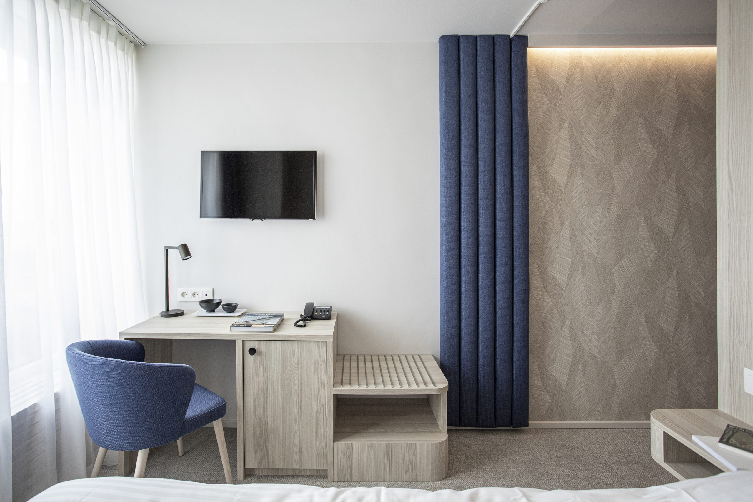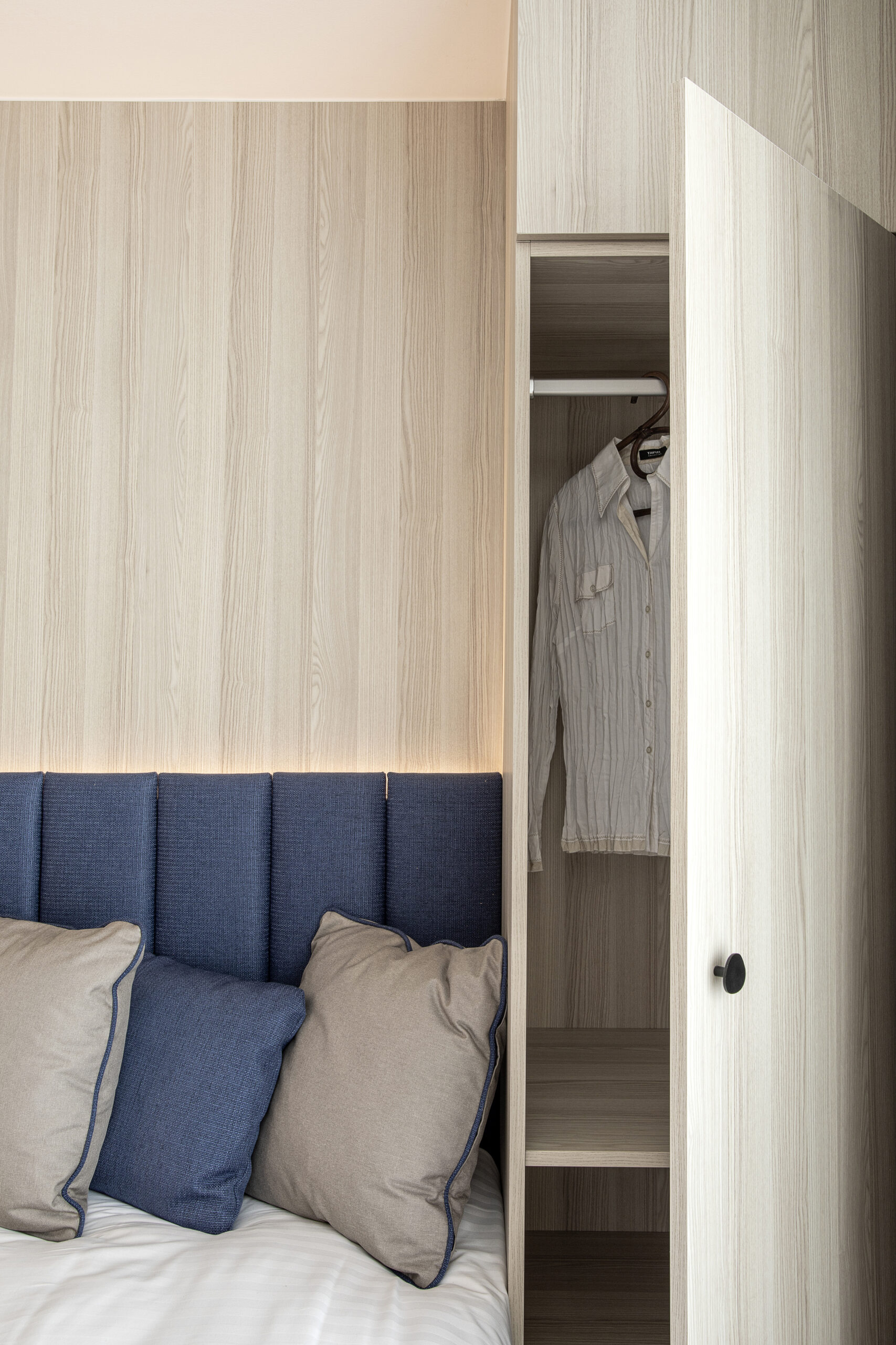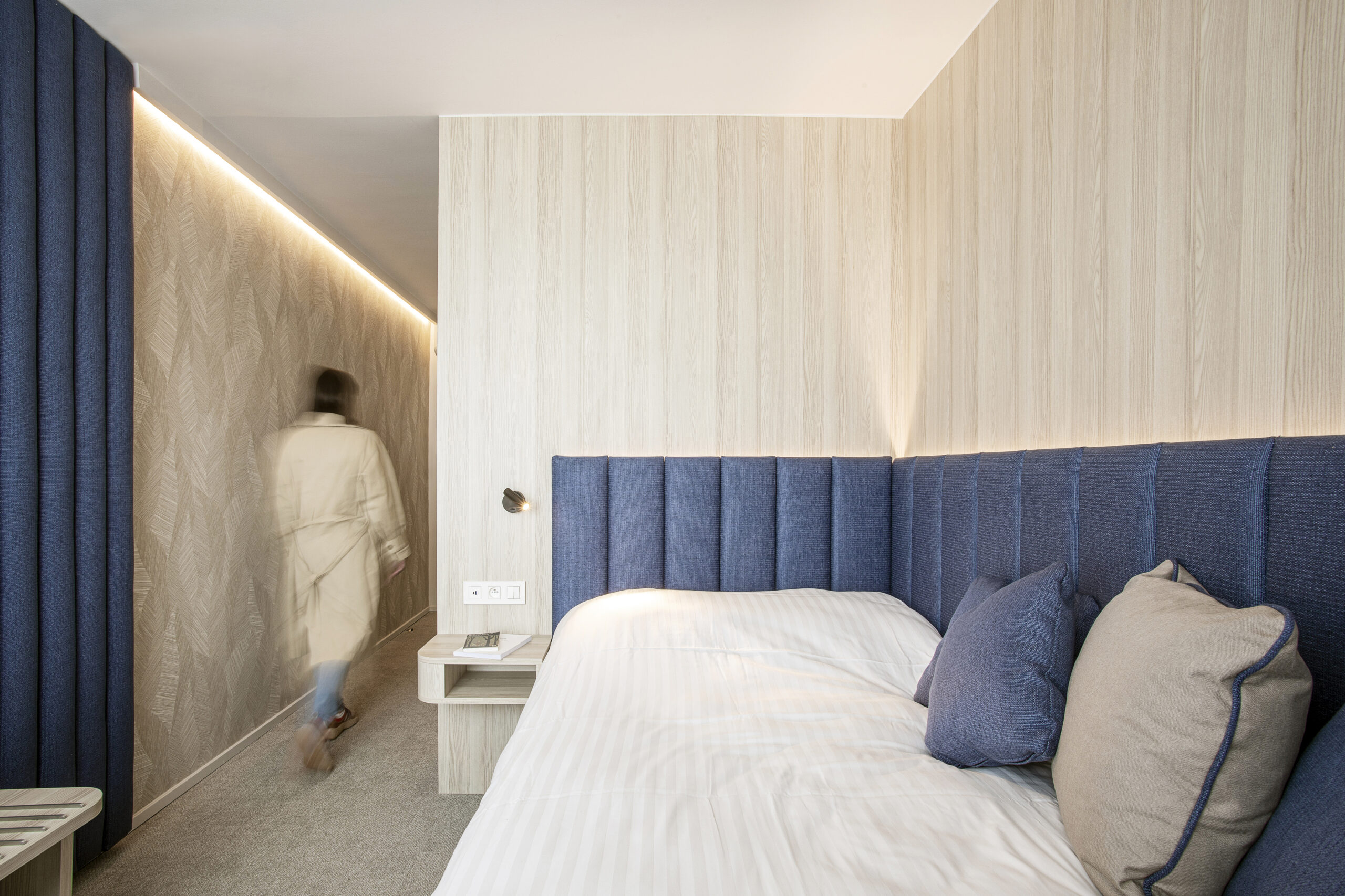 L’objectif était de créer un cocon douillet dans un espace restreint, offrant à l’hôte tout le confort d’un hôtel quatre étoiles. Cette atmosphère chaleureuse a été réalisée en utilisant des tons de chêne clair et un camaïeu de beige, apportant douceur et sérénité. Une touche de bleu profond crée un contraste harmonieux, équilibrant l’ensemble. Le papier peint à motifs végétaux ajoute de la texture, tandis que les voilages aux fenêtres contribuent à la légèreté et à l’élégance de l’espace.