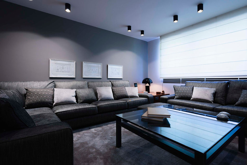 Les cotons cossus et structurés, le moiré des velours et de la moquette, les graphismes géométriques des coussins et l’éclairage chaud créent un univers ton sur ton feutré et intemporel pour ce salon de lecture.