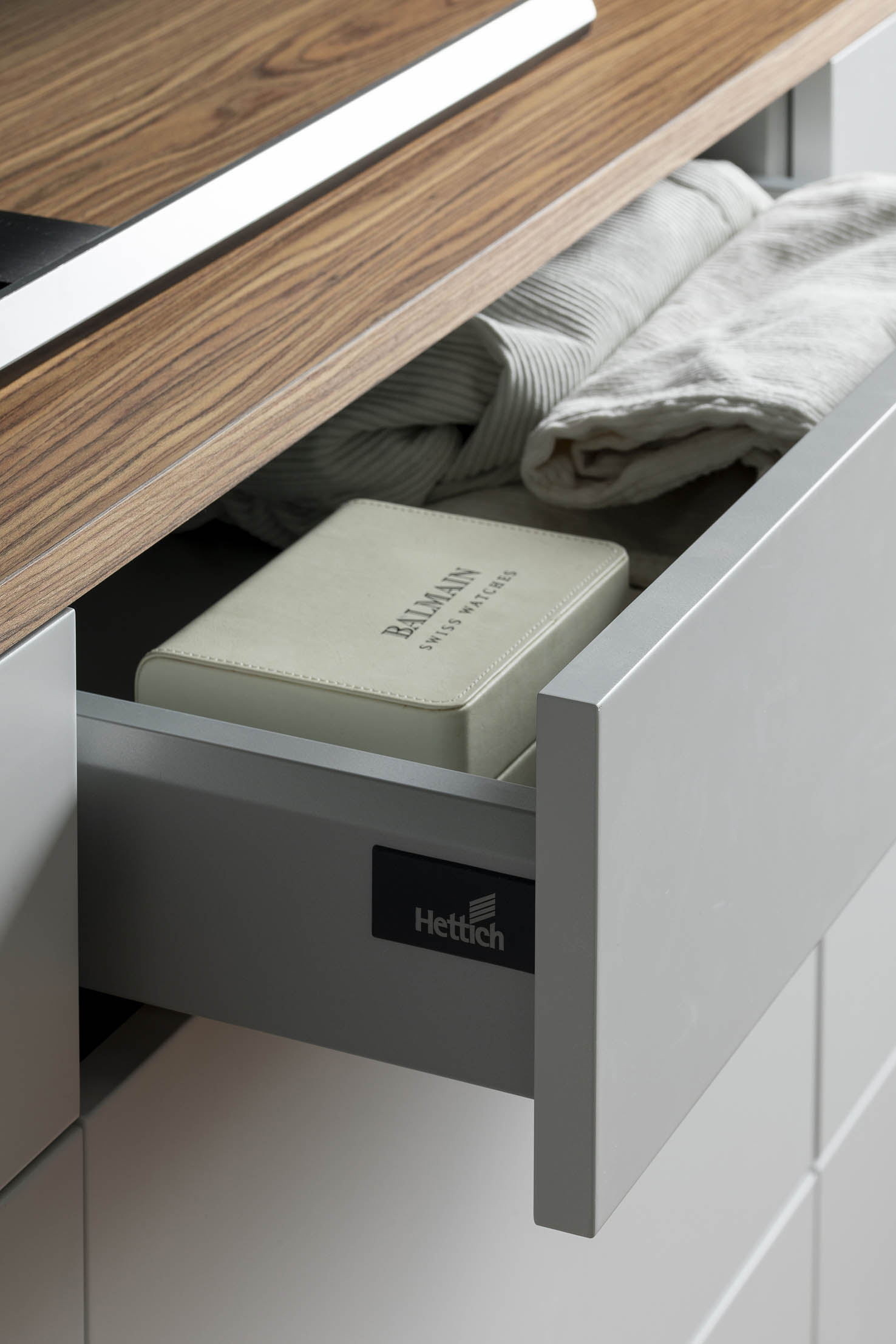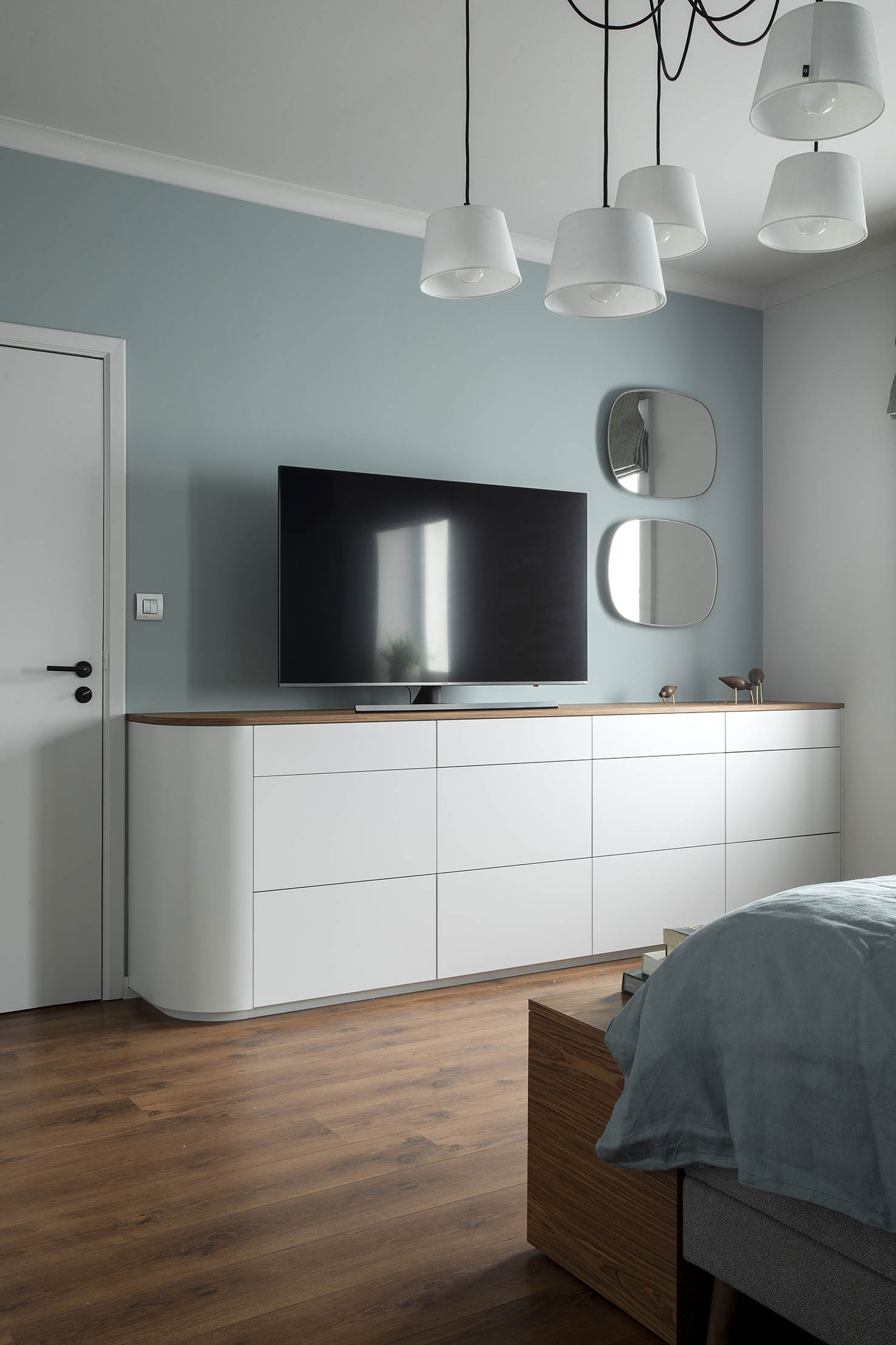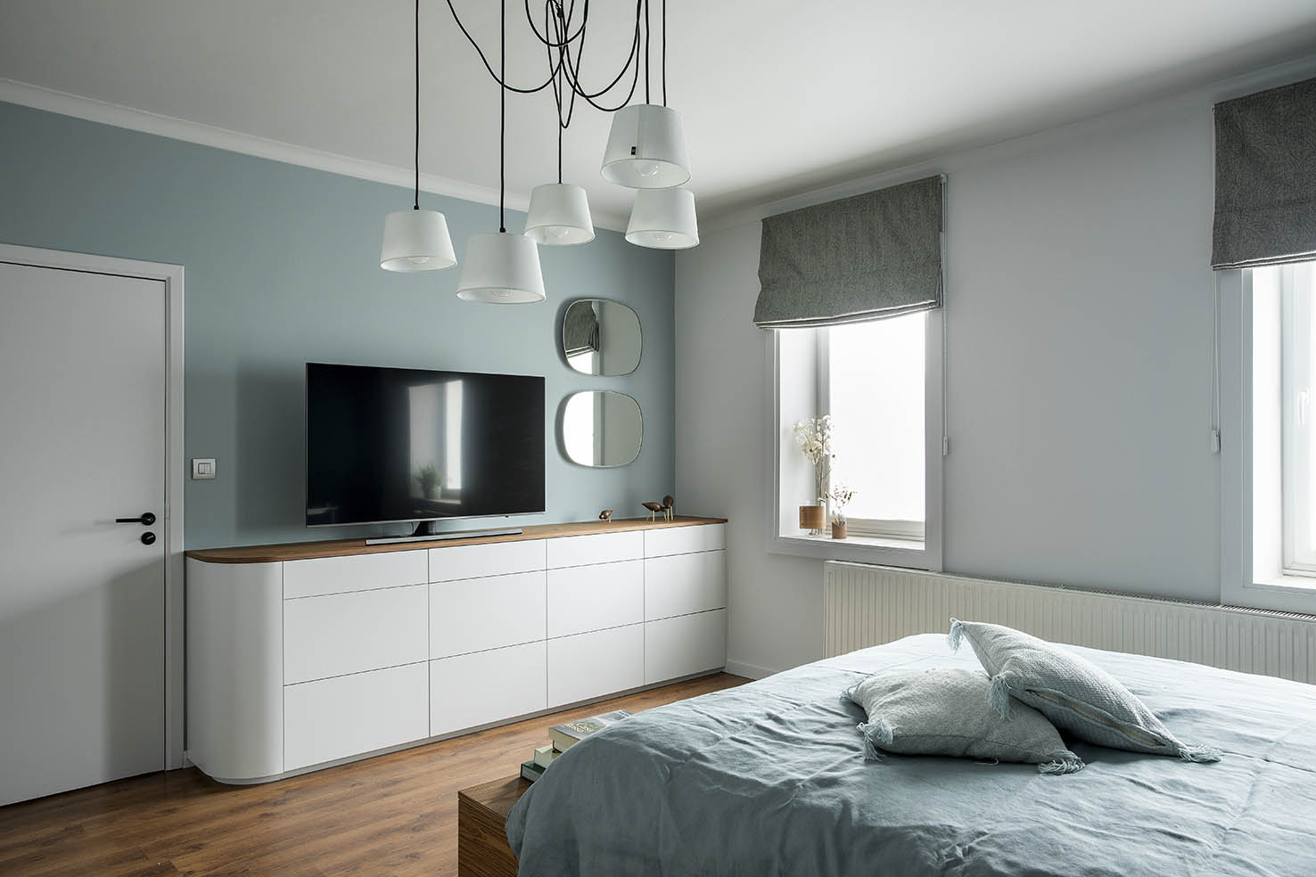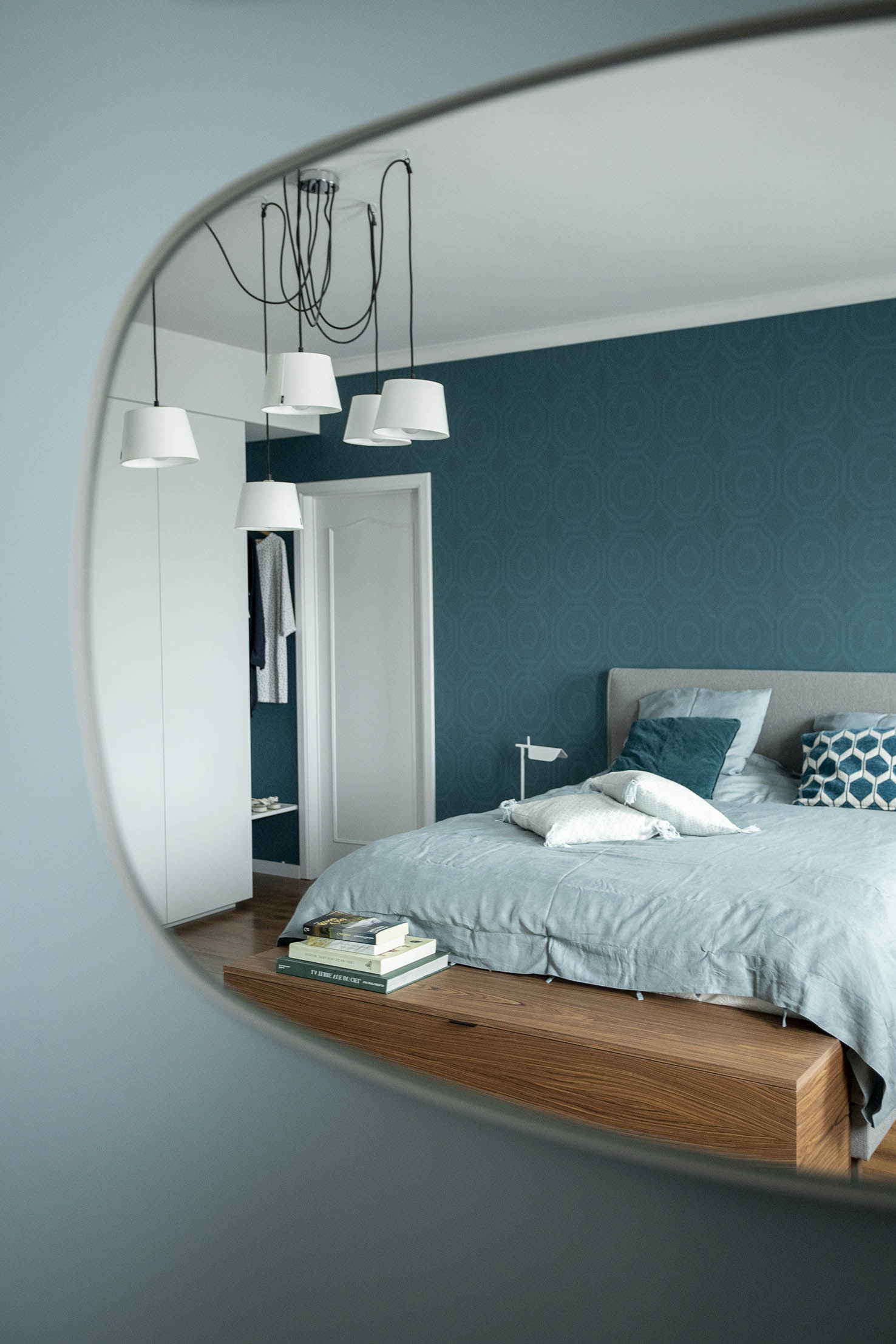 Les trois meubles sur mesure sont les joyaux de cette réalisation : un dressing laqué mat avec des miroirs intégrés, une banquette-coffre qui conjugue confort et praticité et un meuble bas qui sert de rangement pour les bijoux et les vêtements ainsi que de support pour la télévision. Nous avons également mis l’accent sur l’association entre le bleu/vert turquoise et le bois noble de palissandre.