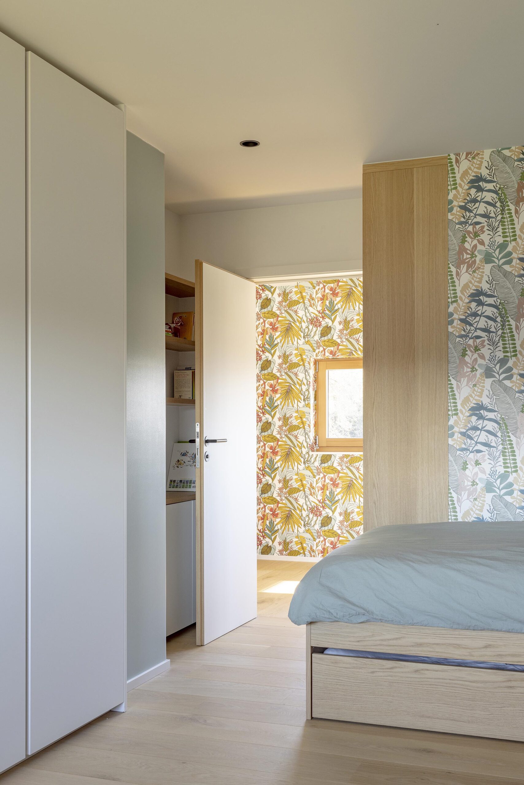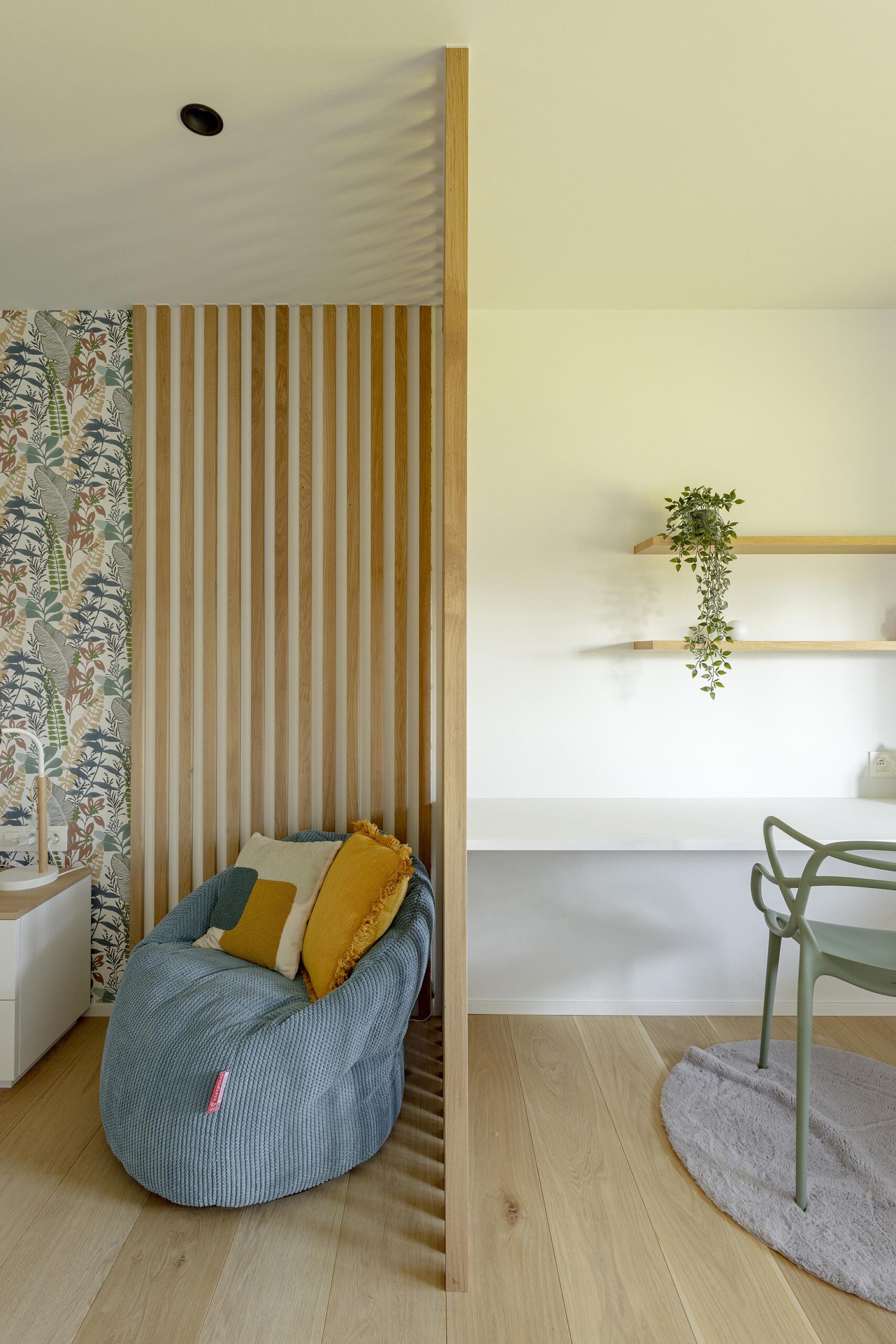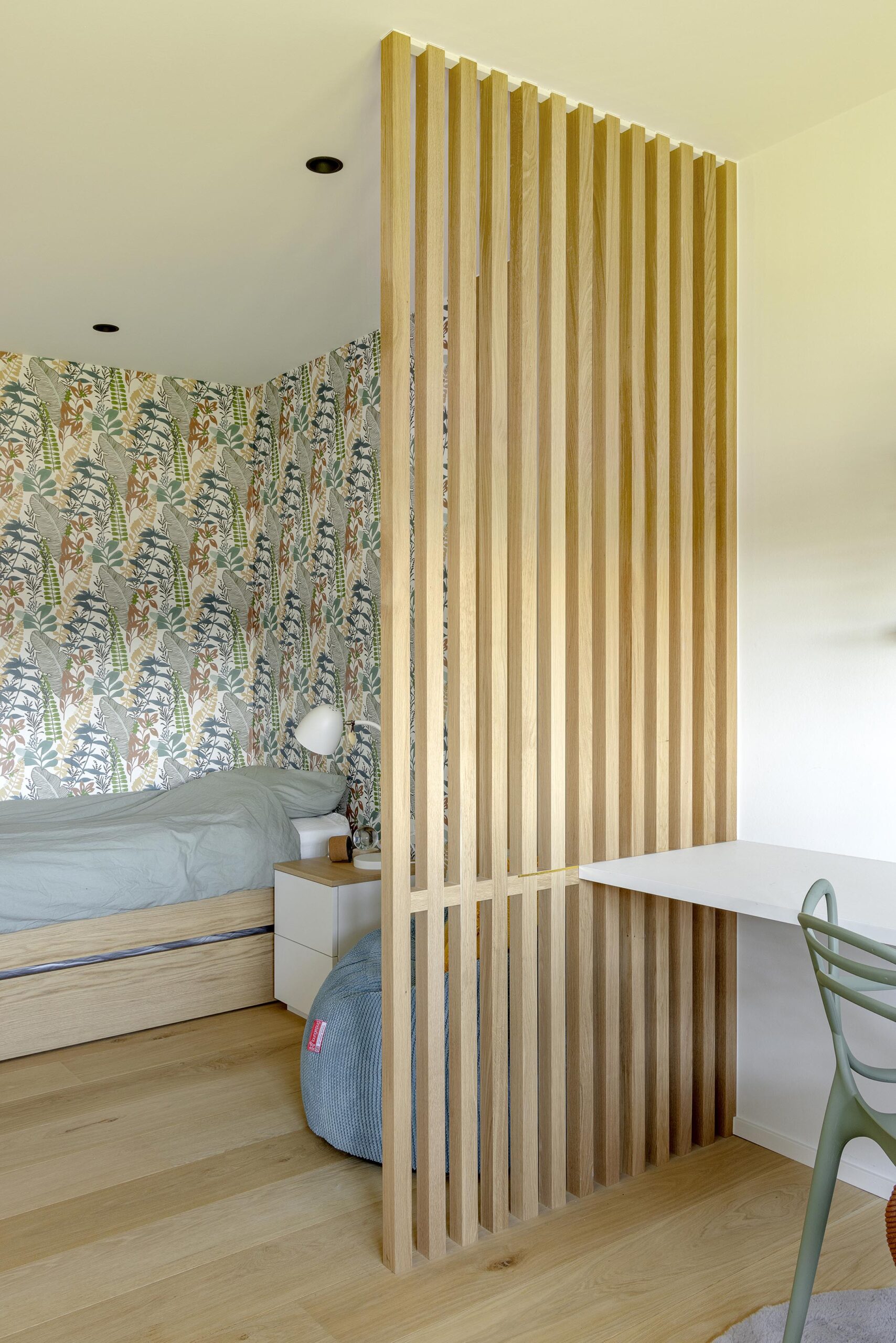 Pour structurer la pièce et distinguer clairement les différentes zones, un claustra en bois sépare l’espace nuit du coin bureau. Cette séparation apporte une sensation de sécurité et d’intimité tout en conservant une belle fluidité visuelle. D’un côté, un lit dans une ambiance cocooning ; de l’autre, un vaste bureau pensé pour encourager la créativité et la concentration. Un aménagement sur mesure qui répond parfaitement aux besoins d’un espace multifonctionnel.