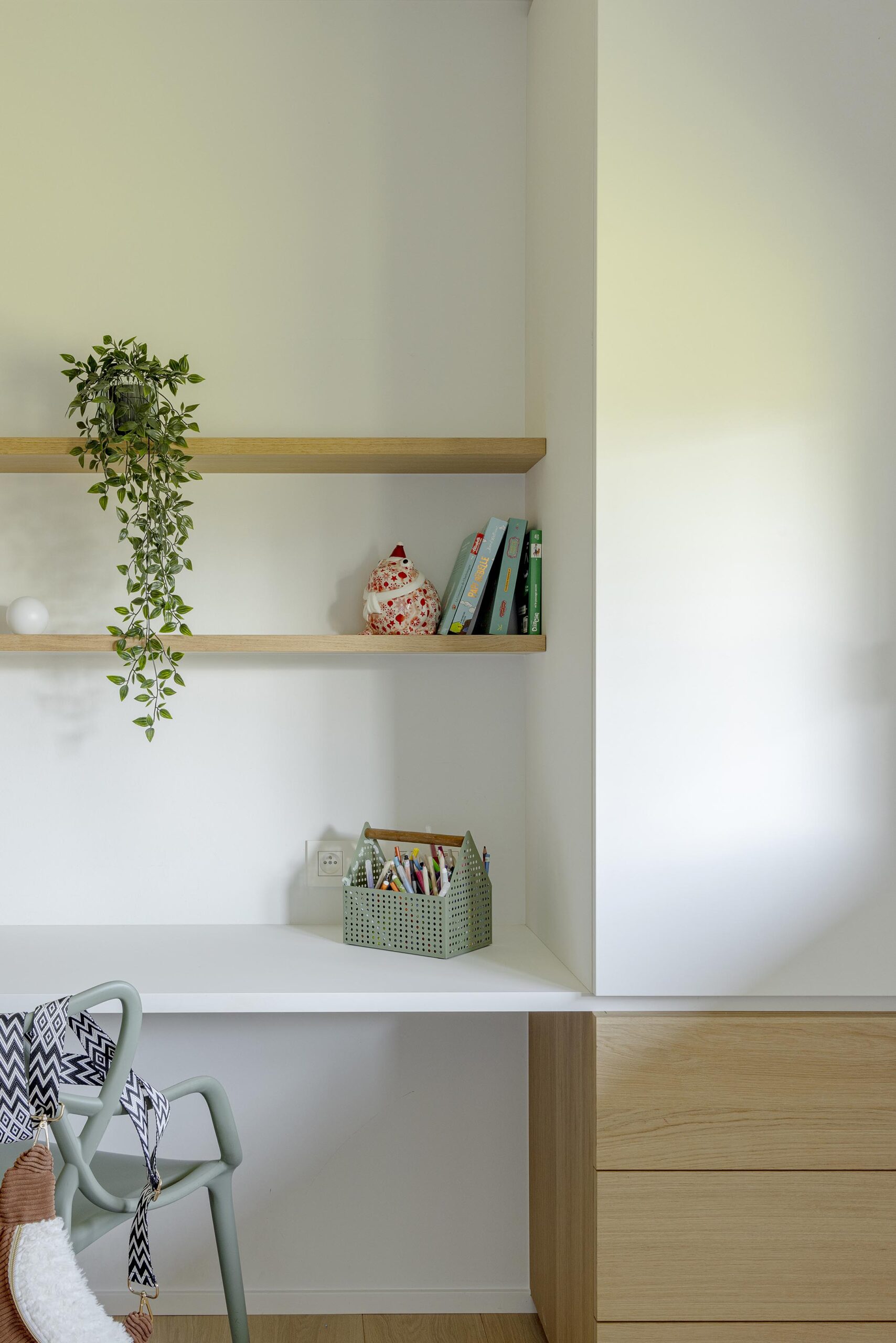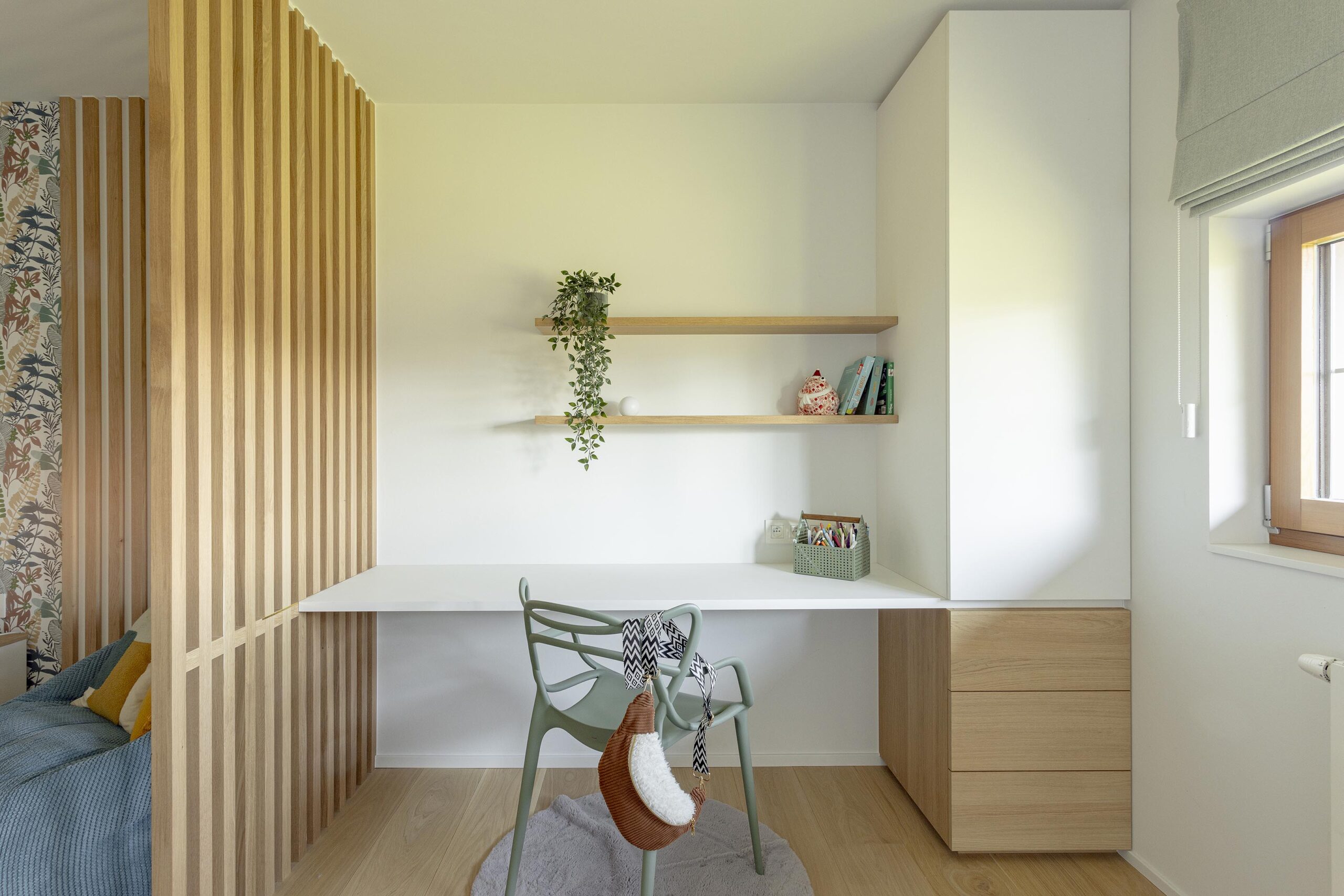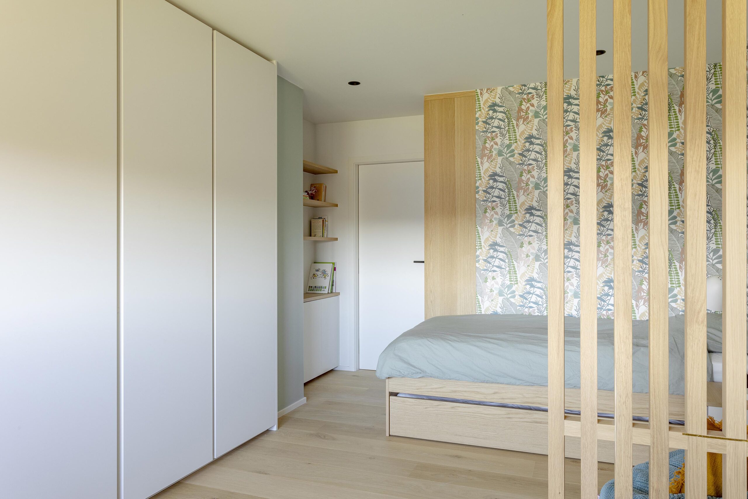 Pour structurer la pièce et distinguer clairement les différentes zones, un claustra en bois sépare l’espace nuit du coin bureau. Cette séparation apporte une sensation de sécurité et d’intimité tout en conservant une belle fluidité visuelle. D’un côté, un lit dans une ambiance cocooning ; de l’autre, un vaste bureau pensé pour encourager la créativité et la concentration. Un aménagement sur mesure qui répond parfaitement aux besoins d’un espace multifonctionnel.
