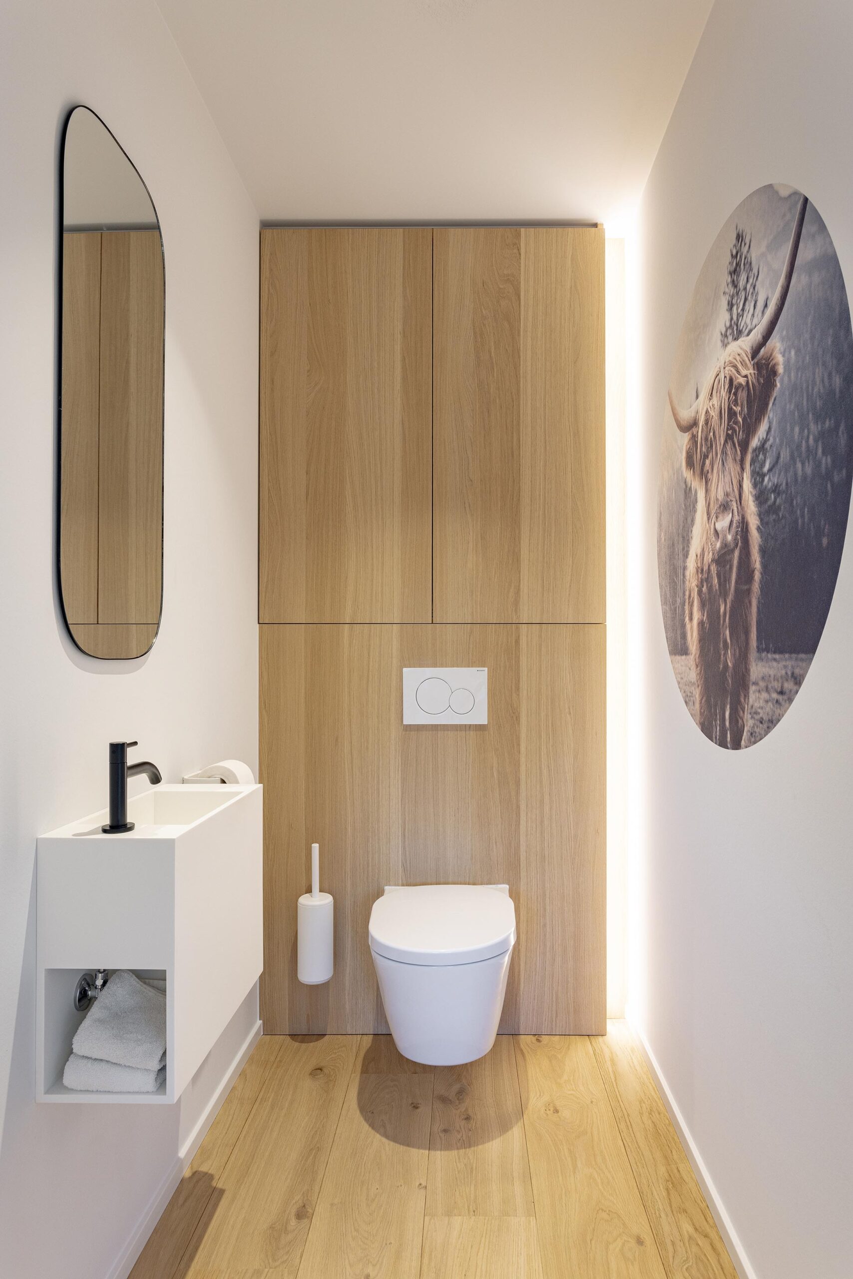Pour allier esthétisme et praticité, des rangements sur mesure ont été intégrés, offrant une solution discrète et élégante. Même les portes se fondent dans le décor pour une continuité visuelle parfaite. Derrière l’une d’elles se cache un espace sanitaire optimisé, équipé de rangements astucieux et sublimé par un ruban LED vertical qui apporte une touche moderne et raffinée.